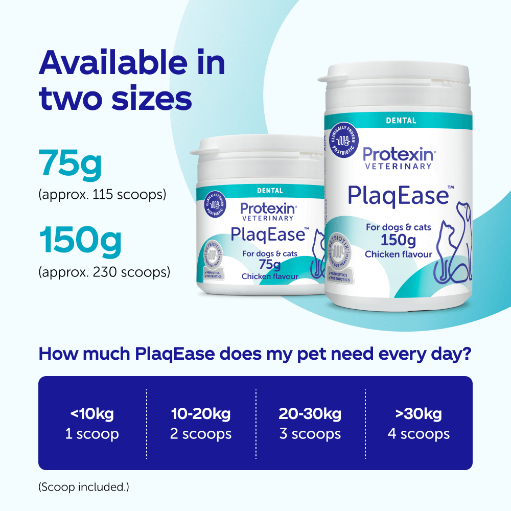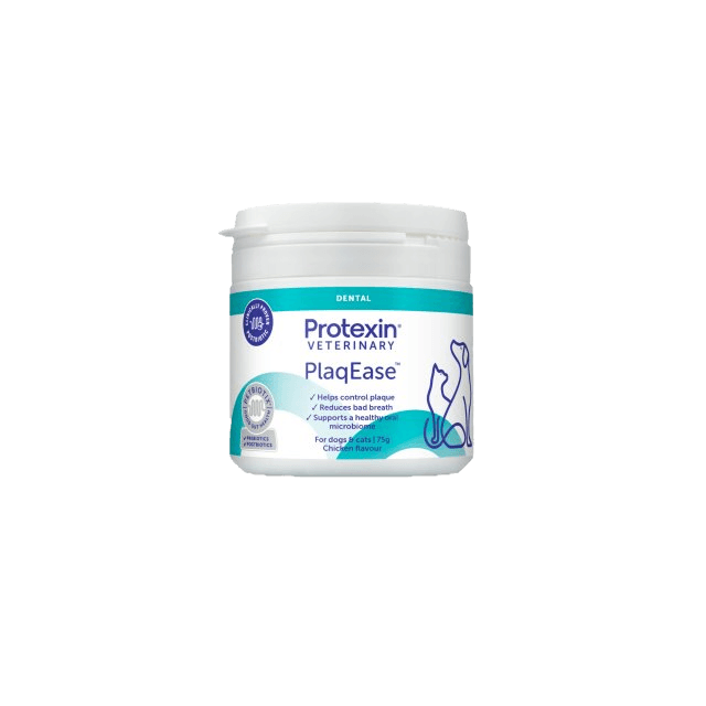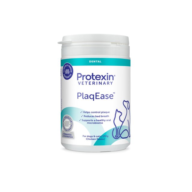 Protexin PlaqEase Dental Powder for Dogs & Cats is a pre & postbiotic dental powder for dogs and cats that: