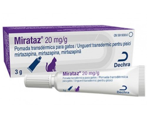 Mirataz 20 mg/g Transdermal Ointment for Cats contains Mirtazapine and is used for body weight gain in cats experiencing poor appetite and weight loss resulting from chronic medical conditions.